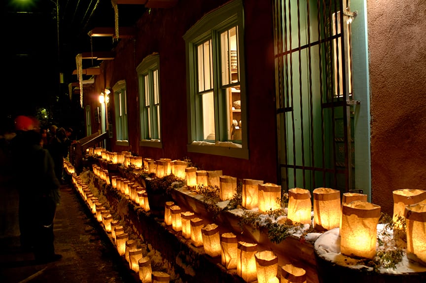 Come dusk on Christmas Eve, you’ll be fortunate to join residents and visitors on Canyon Road, just a mile from the Plaza, to walk and sing beneath the incandescence of thousands of holiday lights. The popular Farolito Walk follows the route among hand-lit farolitos and holiday lights on adobe homes, businesses, trees, statues—everywhere. People stop to warm themselves at bonfires or to drink hot chocolate. The much-loved community tradition draws crowds in snow or starlight and spills over into the surrounding area. The radiating glow rises from the heart of the city, carrying the spirit of Santa Fe and of the holidays into the night beyond.