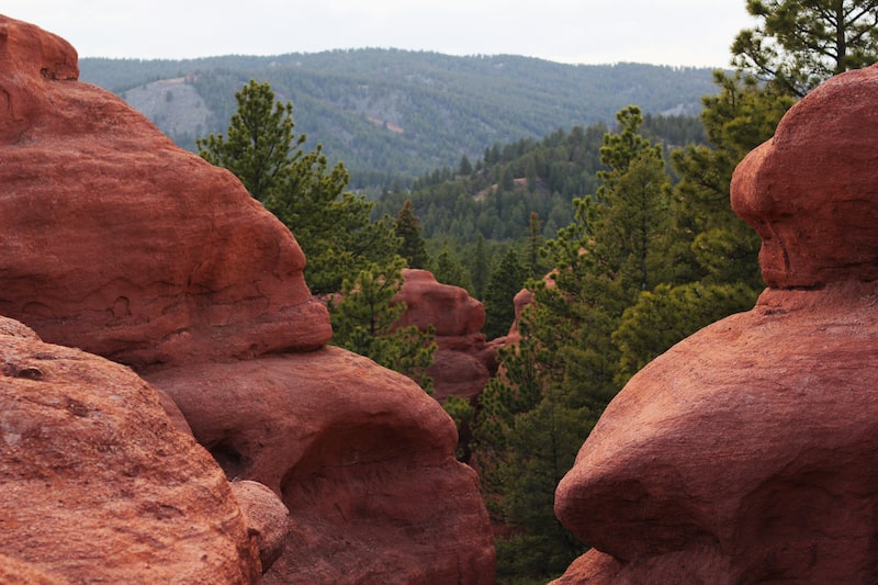 Yes, you’ll be tempted to climb the rocks, and there are ways for hikers to reach the top. The sandstone can be slippery, so be careful and don’t take a step more unless you’re confident. The views from above stretch for miles in every direction: rolling hills, forests and panoramic views of Pikes Peak that’s a great place for photos.